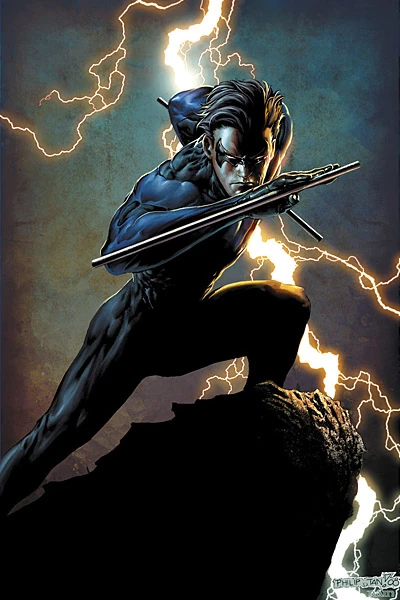 While Nightwing is in many ways just as serious and dedicated a crimefighter as his mentor, the Batman, he is far more of a "people person" being generally quite gregarious and charismatic. He -enjoys- being around people and tends to draw them to him rather than push them away, but he does at times have a tendency to get moody and broody, and start alienating friends and family (though he usually manages to get over it relatively quickly). He's also more than a bit of a showman, and his snappym patter and daring acrobatics feed into this role quite nicely. He's a natural leader with a "take-charge" attitude, and despite his apparent youth is a very experienced crimefighter, often serving as a "voice of reason" amongst his peers. He is deeply compassionate and always tends to look out for the "little guy." Dick is also tremendously loyal to his friends and family, and usually more than willing to "drop everything" to help them.